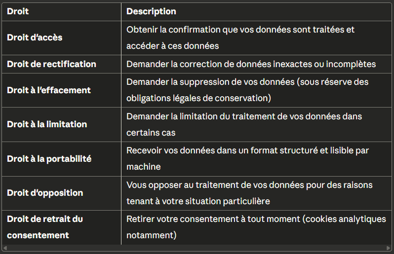 Conformément au Règlement Général sur la Protection des Données (RGPD) et à la loi Informatique et Libertés, vous disposez des droits suivants :