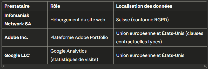 Vos données personnelles peuvent être partagées avec les prestataires techniques suivants, strictement dans le cadre de leurs missions :