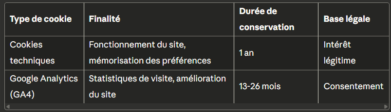 Durée de conservation : 3 ans à compter du dernier contact (conformément aux recommandations CNIL pour la prospection commerciale).